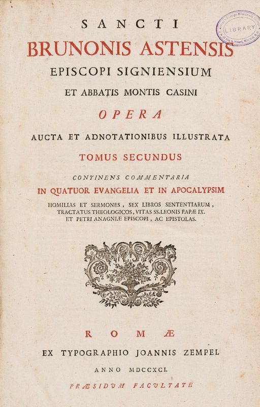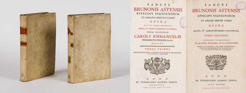 Opera. [Sancti Brunonis Astensi Episcopi Signiensium et Abbatis Montis Casini Opera in Duos Tomos Distributa aucta et Adnotationibus Illustrata Regiae Celsitudini Caroli Emmanuelis Pedemontii Principis &c. &c.].