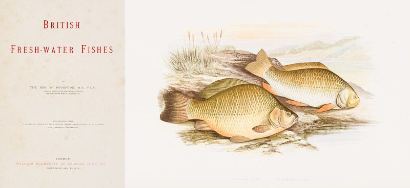 Collection of 76 Publications / Book-titles (several of which have multiple Volumes) on Fly Fishing, General Angling [Sharks, Trout, Salmon etc.], Fishing, Fish in Culture and Zoology, Fish in Cooking and Fish-Preservation (for storage and cooking) plus one vintage metal box with 85 (!) antique / vintage Flies (Salmon-Flies / Trout-Flies), professionally tied in early 20th century Ireland (West Cork, c.1920-1940). Published between the years 1851 and 1999, this excellent and extensive collection includes for example William Houghton’s 1879-edition of British Fresh-Water Fishes with all the chromolithographs, as well as the very rare, first ever publication on Salt-Water-Flyfishing, with hand-coloured plates on Connemara Fly Fishing from 1851 with Flyfishing and Angling in America / Nova Scotia / Connemara – Fly-Fishing at Lough Ina, near Clifden, in Bertraghboy Bay, at the Skyard Rocks, at Deer Island and off the Isle of Mweenish and the Isle of Arran etc. etc. [See each book in this collection listed on our website under “Libraries & Collections”].