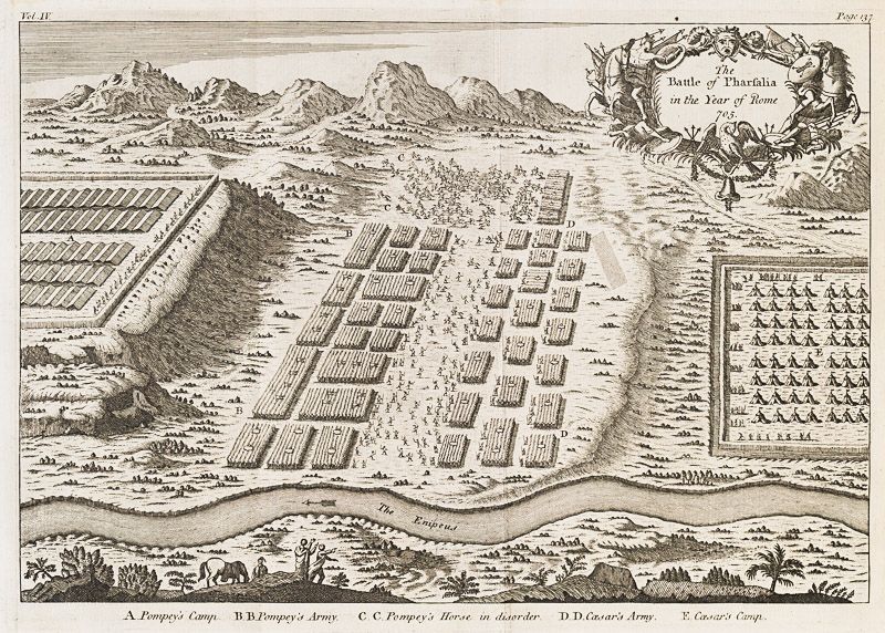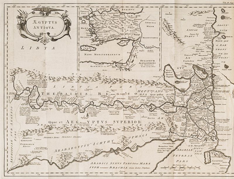 1. Large Folded plate with the Battle of Pharsalia / 2. The Extra – Large folded map “Aeqyptus Antiqua – Libya” with an inset of Asia Minor (Turkey) and Palestine. This map measures 52.5 cm x 43 cm and has a minor tear only.