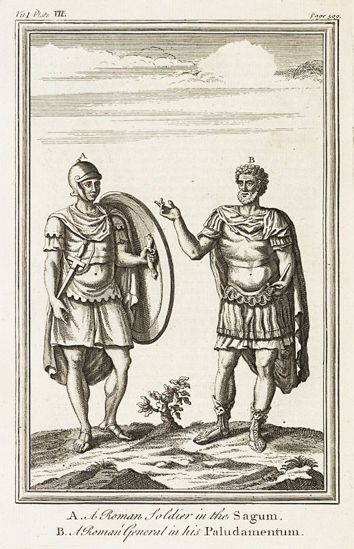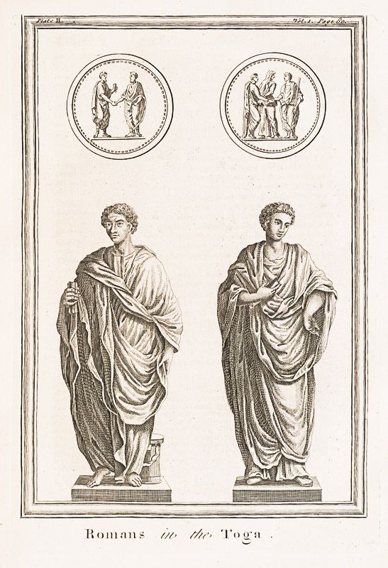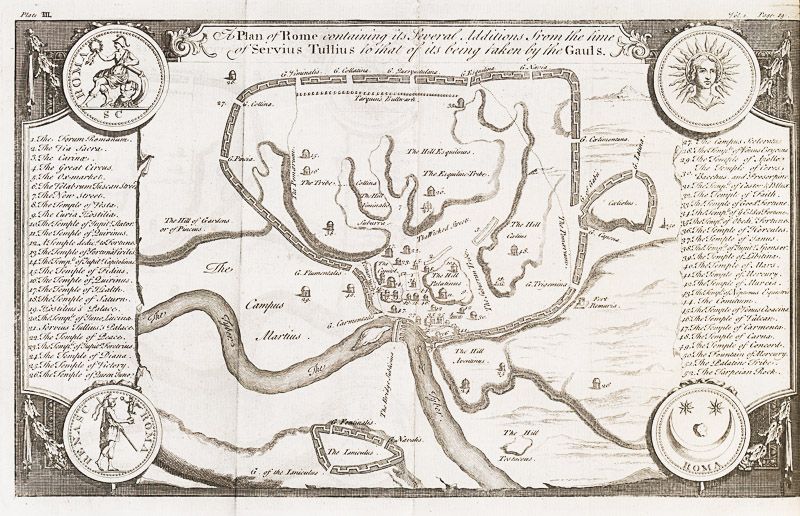 Plates: 1. The beautiful, large and folded Plan of Rome (33 cm x 26.5 cm) – Titled: “A Plan of Rome, containing its several Additions from the time of Servius Tullius to that of its being taken by the Gauls” / 2. Roman Citizen’s in Toga /