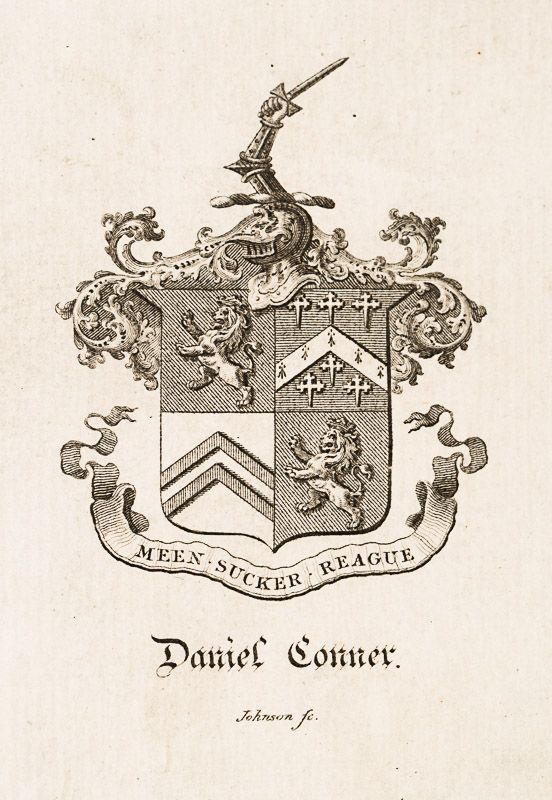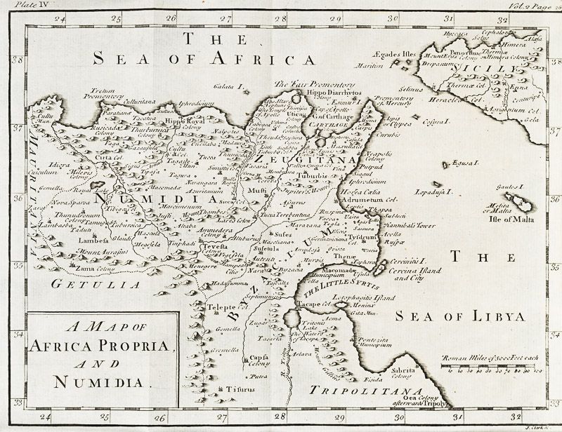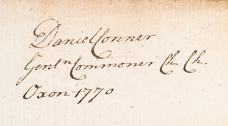 The Fourth Edition. Four Volumes (complete set with all maps and plates). London, Printed for J. and R. Tonson; Hawkins and T.Longman, 1766 – 1771. Quarto (27 cm x 22 cm). Collation: Volume I: Frontispiece, XLVI, XLVI, 634 pages with 10 plates and 3 maps / Volume II: Frontispiece, XXXII, XXXII, 668 pages with 8 maps / Volume III: Frontispiece, VI, 694 pages with 5 maps / Volume IV: Frontispiece, VII, 464 pages plus 76 unnumbered pages of a General Index and 1 plate and 1 map. Hardcover / Original 18th-century leather with gilt lettering and labels on spine. Interior of this set with all maps and illustrations in excellent, very clean condition. The boards of the bindings with abrasions and some bumping but overall very firm. Some stronger peeling of the leather on board of Volume I, Only three pages with minor tears. The large map of Northern Africa (Palestine, Egypt and Libya) with a minor tear. The stunning maps and plates in timeless beauty. Highly underestimated work, in the shadow of Gibbon but with meticulous detail in presenting the geographical impact of the Roman Conquest. From the library of Daniel Conner (Connerville / Manch House), with his Exlibris / Bookplate to pastedown.