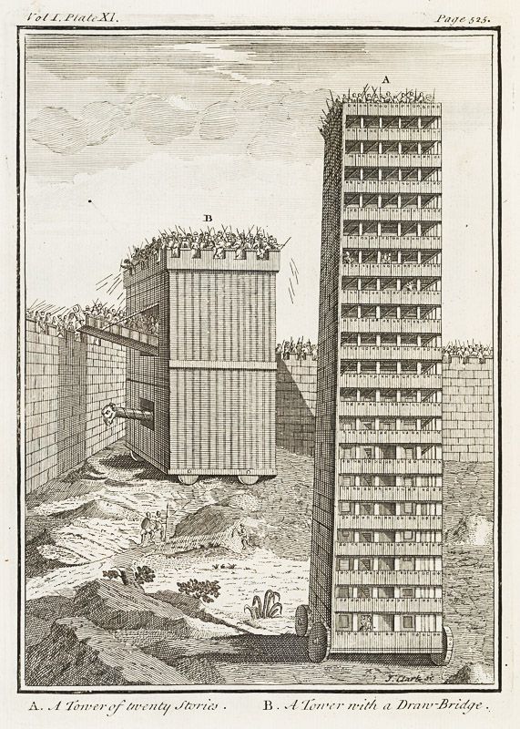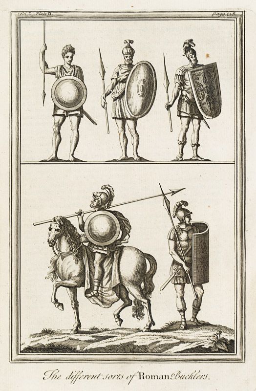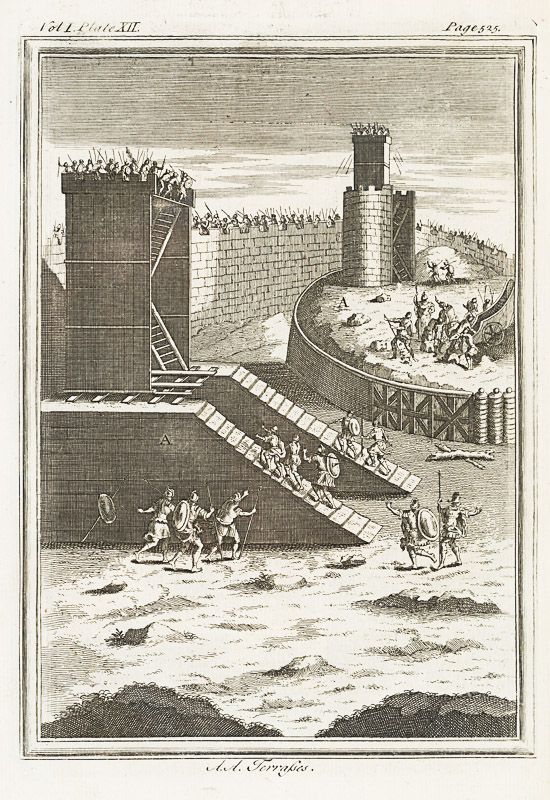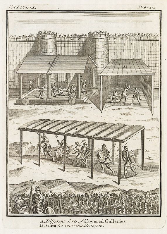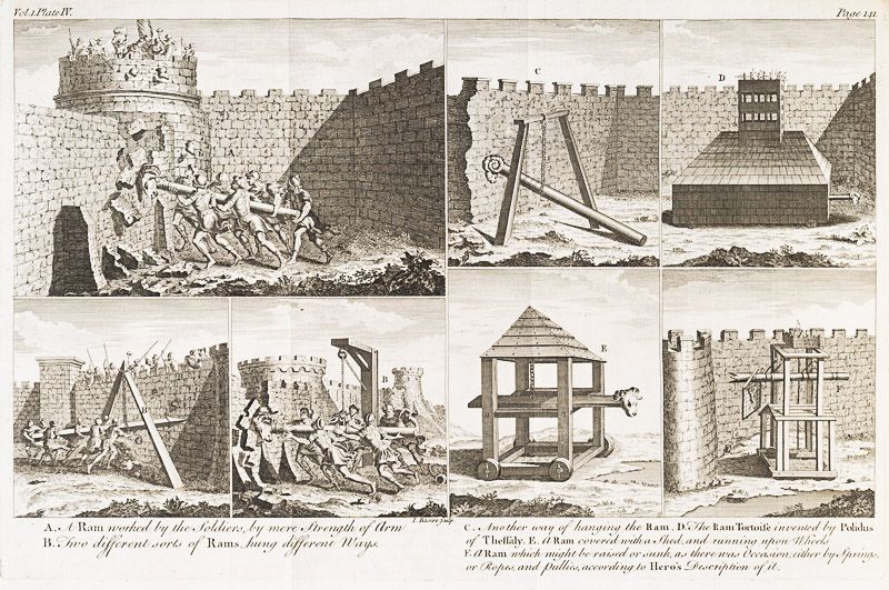 Roman Warfare – Illustrations: 1. Rams / 2. Trictinium / 3. Roman Soldier and General / 4. Roman Army in Battalion Formation / 5. Roman Bucklers / 6. Covered Galleries / 7. Tower / 8. Terrassos /