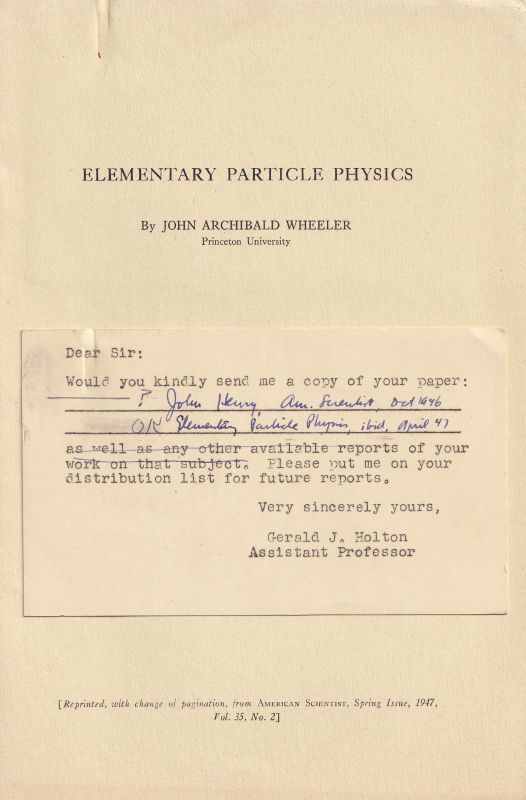 [Princeton], Reprinted from “American Scientist”, 1947. Octavo. 20 pages. Original Softcover. Very good condition with only minor signs of external wear. Manuscript entry of titles Holton requested from Wheeler on the postcards / in ink. Postcard stamped with “Jefferson Physical Laboratory – Harvard University”