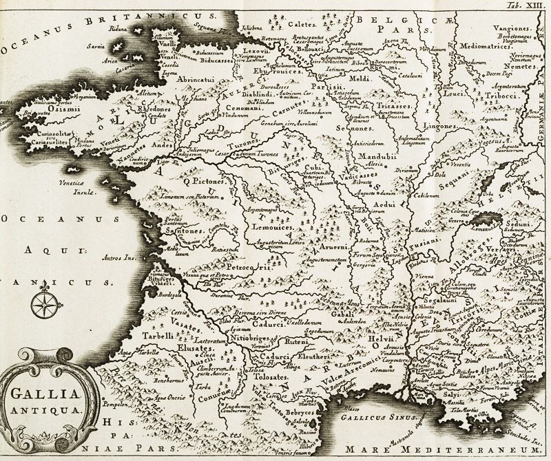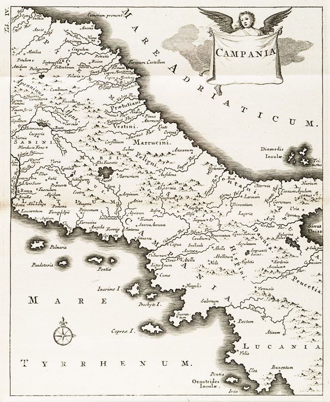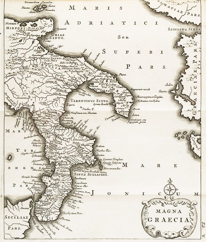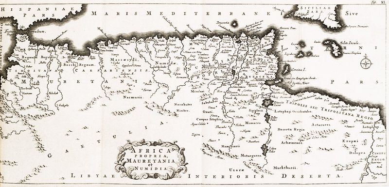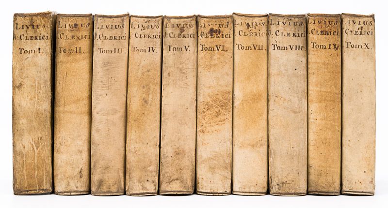 Amsterdam / Utrecht, Henric Wetstenius / Willem van de Water, 1710. Small Octavo. Volume I: Frontispice, [30 unnumbered pages], 455 pages / Volume II: Frontispice, 490 pages / Volume III: Frontispice, 470 pages / Volume IV: Frontispice, 446 pages / Volume V: Frontispice, 460 pages (page 161 loosely inserted) / Volume VI: Frontispice, 495 pages / Volume VII: Frontispice, 506 pages / Volume VIII: Frontispice, 496 pages / Volume IX: Frontispice, 504 pages / Volume X [being Geographia Liviani – complete with [all called for] 14 folded maps: Frontispice, several folded maps and Index, 363 pages plus ‘Tabularum Geographicarum’. Hardcover / Original, contemporary vellum with manuscript title to spine. Very good condition with only minor signs of external wear and new endpapers and minor repairs to Volume I. One page loosened. Exlibris / Armorial Bookplate of Daniel Conner to pastedown of each Volume. All the allegorical frontispices in excellent condition. The folded maps in breathtaking condition (see images for each map on our website).