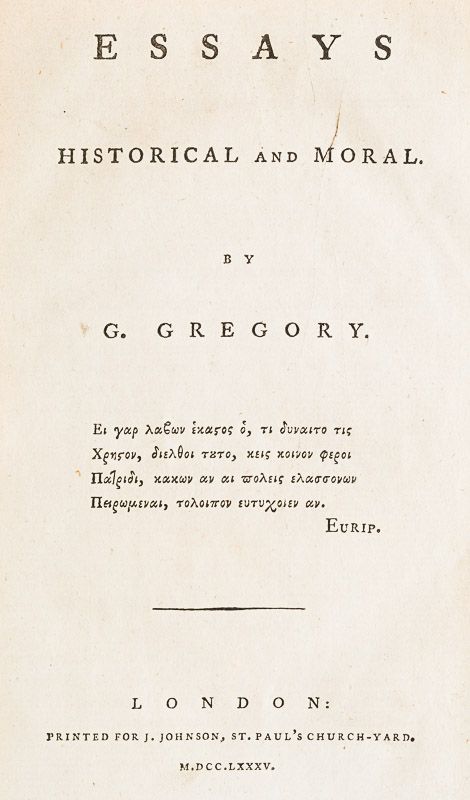 Essays – Historical and Moral [including “Freedom of Speech and of the Press” and “Resistance to the Legislature” an ‘Essay on the Slavery of the Female Sex’ – ‘Of the Schemes asserting an Equality of the Sexes’ and ‘The History of the Female Sex’ and the ‘General State of the Controversy concerning the Inferiority of the Female Understanding’ / “Inquiry how far our commerce would be affected by the Abolition of the Slave Trade in respect of our West India Colonies”].
