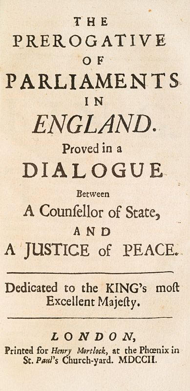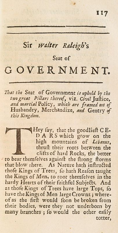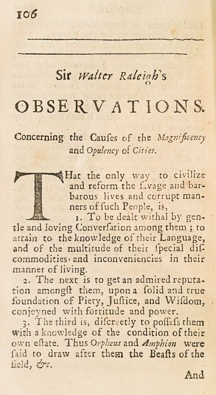 Sammelband of Writings by Sir Walter Raleigh: Remains of Sir Walter Raleigh : Maxims of State – Advice to his Son : His Son’s Advice to his Father. His Sceptick. Observations concerning the Causes of the Magnificiency and Opulency of Cities. [Separate Titlepage: Sir Walter Raleigh’s Observations touching Trade and Commerce with the Hollander and other Nations; proving that our Sea and Land Commodities inrich and strengthen other Countries against our own. With other Passages of High Concernment – London, Printed for Henry Mortlock at the Phoenix, 1702]. His Letters to divers Persons of Quality. [Separate Titlepage: The Prerogative of Parliaments in England, proved in a Dialogue between a Counsellor of State and a Justice of Peace. London, Printed for Henry Mortlock at the Phoenix, 1702]. With the Addition of some Letters never Printed before.