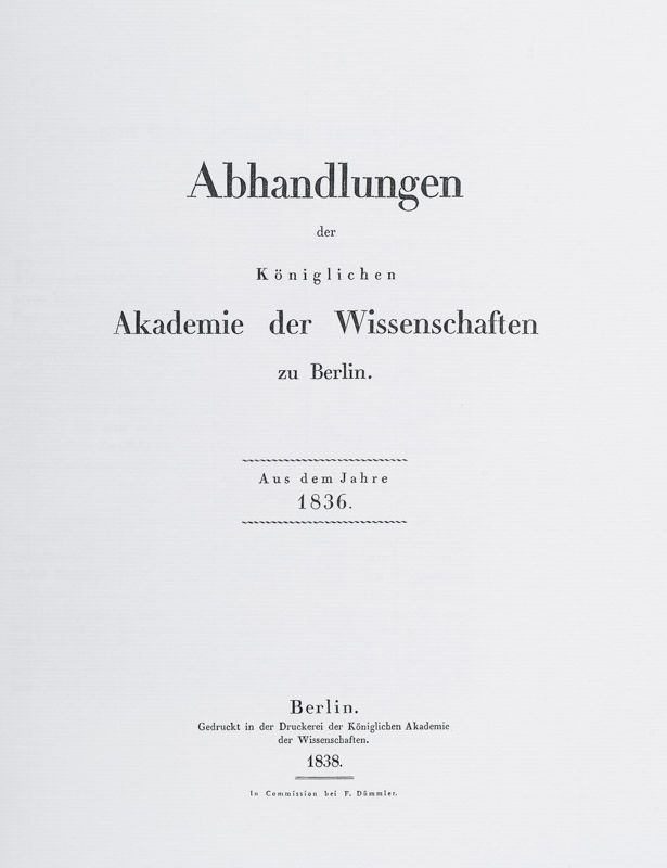 Erste Ausgabe. Berlin, Druckerei der Königlichen Akademie der Wissenschaften zu Berlin, 1836-1838. Quarto (23.2 cm x 28.5 cm). 18 Seiten (Seiten 187 – 205 des Jahrgangsbandes 1836). Moderne Broschur mit eingebundener Originalabhandlung. Sehr guter Zustand. Es handelt sich hier um die seltene, originale Erstausgabe der Publikation. Extrahiert aus dem Sammelband der Abhandlungen der Königlichen Akademie der Wissenschaften zu Berlin. Der originalen Publikation wurde eine Replika des Reihentitels vorgebunden. [Abhandlungen der Königlichen Akademie der Wissenschaften zu Berlin. Aus dem Jahre 1836].