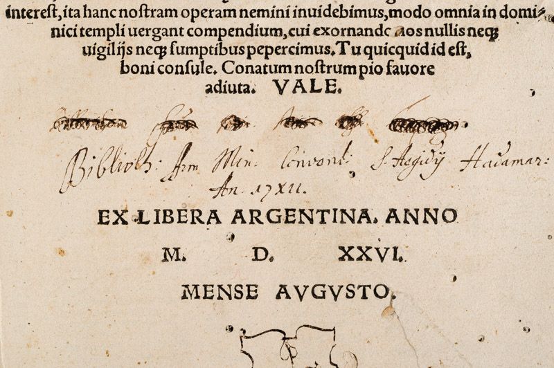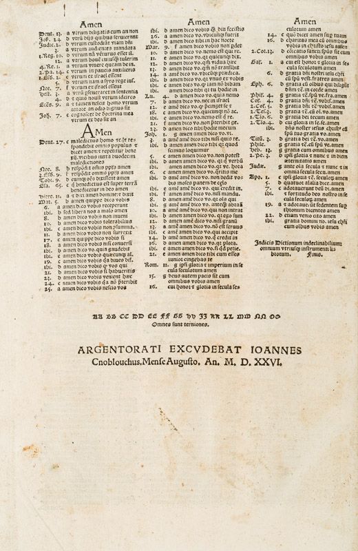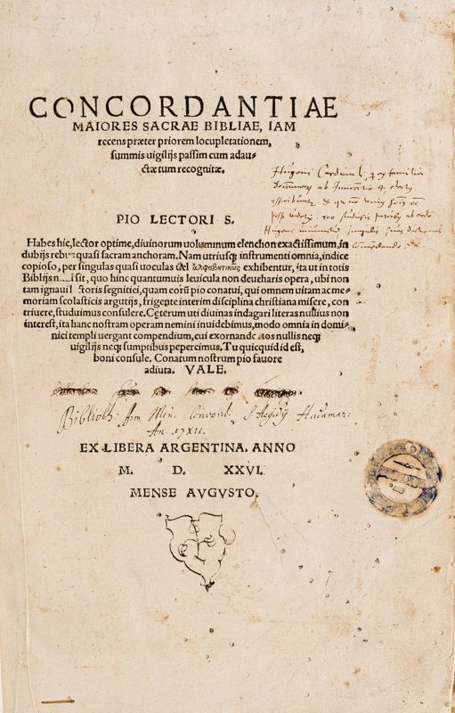 Argentina [Straßburg], Ioannes Cnoblouchus [J. Knobloch d.Ä.], 1526. Folio (22 cm x 31 cm). 407 nn. Bll. Hardcover with new endpapers and an old sheet of Missale-Vellum as board-covering. Masterful binding, reimagining the original 16th century binding-style. Minor wormhole-damage. Otherwise in excellent condition with some minor signs of wear only. With manuscript annotation to the titlepage, mentioning Hugo Cardinali [Cardinal Hugo of Saint-Cher (Hugo de Sancto Charo)]. Former copy of the St.Ägidius Konvent in Hadamar with the old library-stamp obliterated / Ehemaliges Exemplar des Franziskanerklosters in Hadamar, St.Ägidius. Extremely important Bible-concordance. With some annotations in text (at word “Thabor” for example).