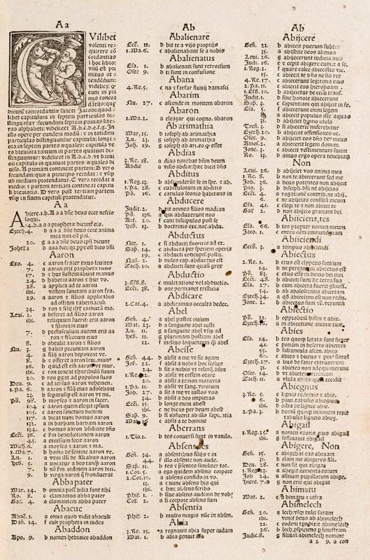 Concordantiae Maiores by the fourteenth century Dominican Conradus de Alemania (Konrad der Jüngere von Halberstadt). Konrad’s concordance, originally compiled in 1310, was an abridgment of the original Bible concordance, compiled c. 1230 by 500 friars under the direction of Dominican Hugues de St-Cher. Because of its more convenient form, Konrad’s concordance became more widely used. Five editions of the Halberstadt concordance were printed in the 15th century and several followed in the early 16th-century. [Source: Jeremy Norman – History of Science]