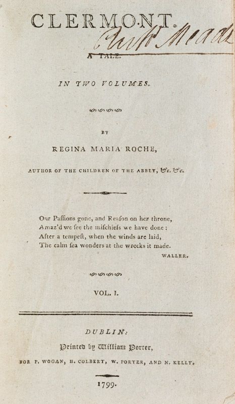 The Children of the Abbey, a sentimental Gothic Romance, was one of the period’s most popular novels of the 1790s. Her book Clermont, was Roche’s only full attempt at writing a truly Gothic novel. It has a decidedly darker in tone than anything else she wrote. Both novels went through several editions and were translated into both French and Spanish. Clermont was one of the Northanger Horrid Novels satirized by Jane Austen in her novel Northanger Abbey. (Wikipedia)