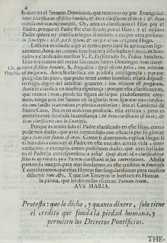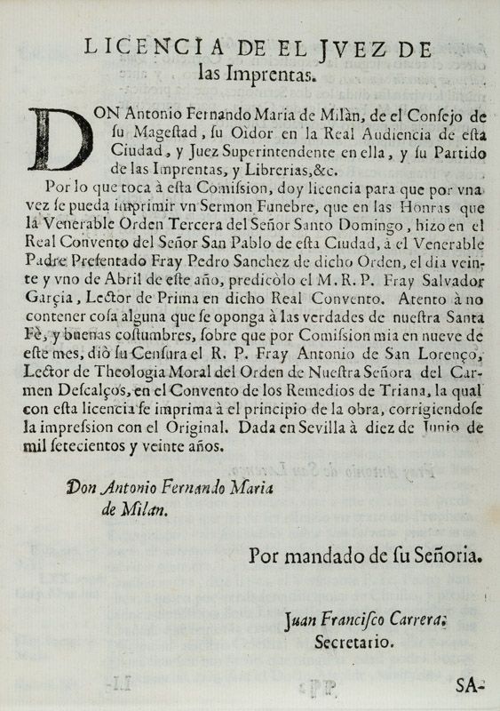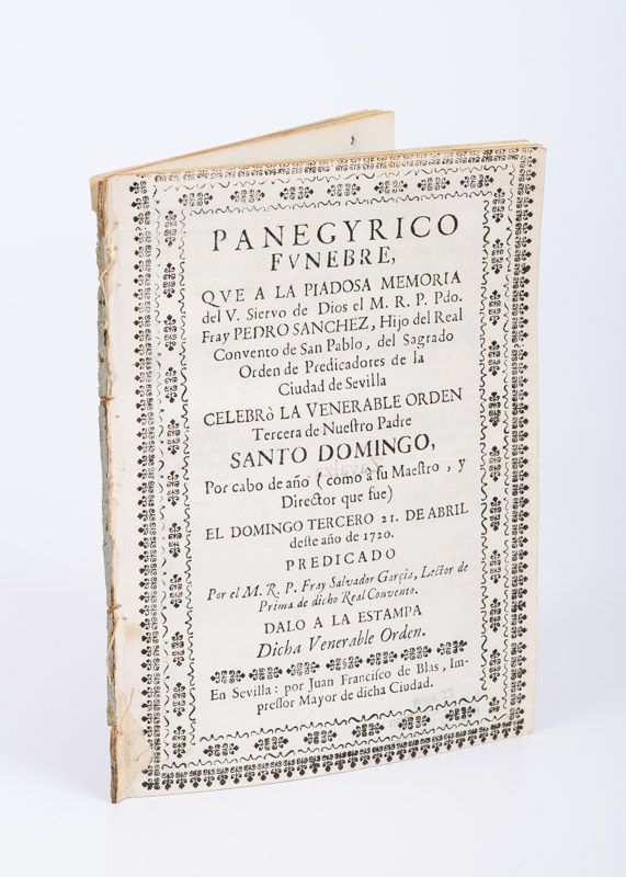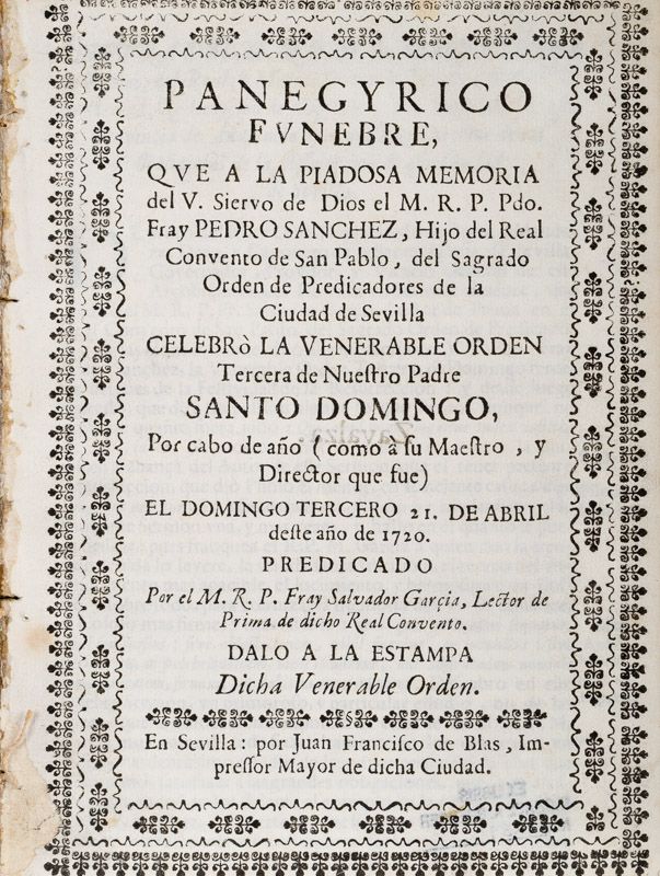 Panegyrico Funebre que a la Piadosa Memoria del V. Siervo de Dios el M.R.P. Pdo. Fray Pedro Sanchez, Hijo del Real Convento de San Pablo, del Sagrado Orden de Predicadores de la Cuidad de Sevilla, Celebrò la Venerable Orden Tercera de Nuestro Padre Santo Domingo, por cabode ano (como a su Maestro, y Director que sue). El Domingo Tercero 21. De Abril deste ano de 1720. Predicado por el M.R.P.Fray Salvador Garcia, Lector de Primade dicho Real Convento. Dalo a la Estampa Dicha Venerable Orden.