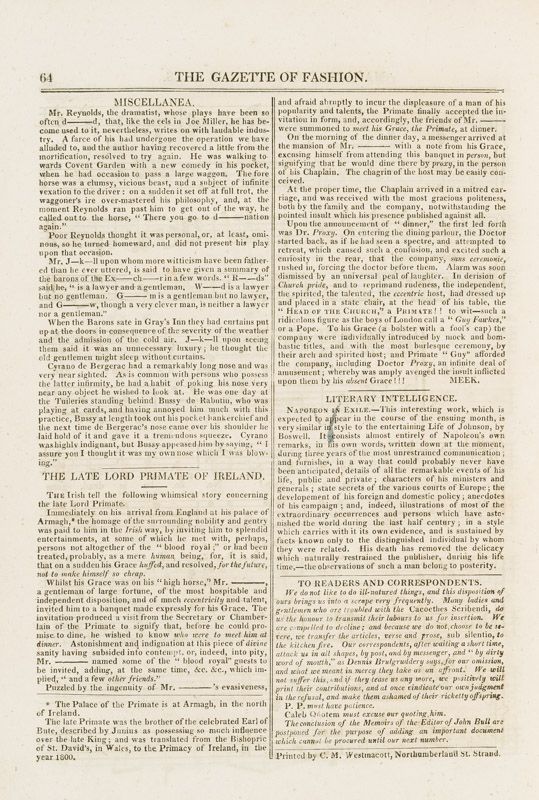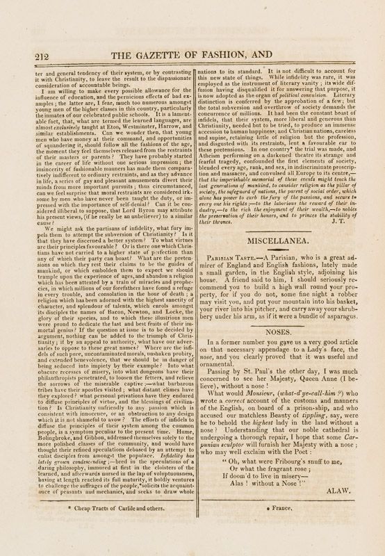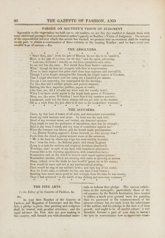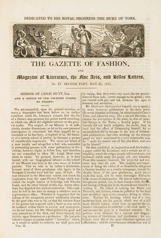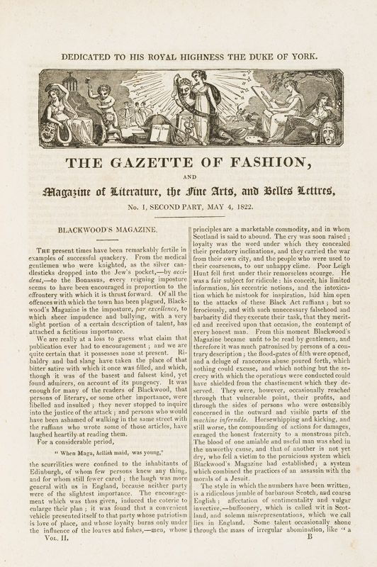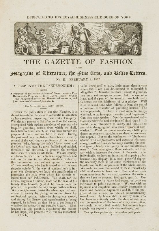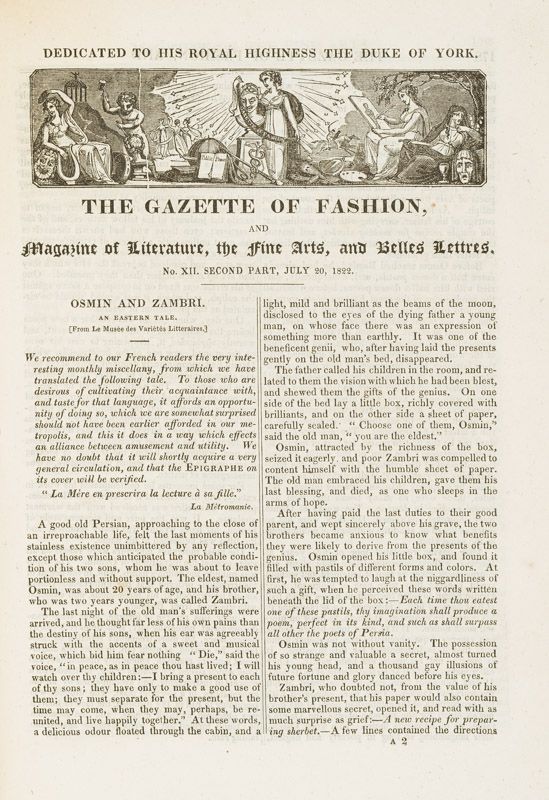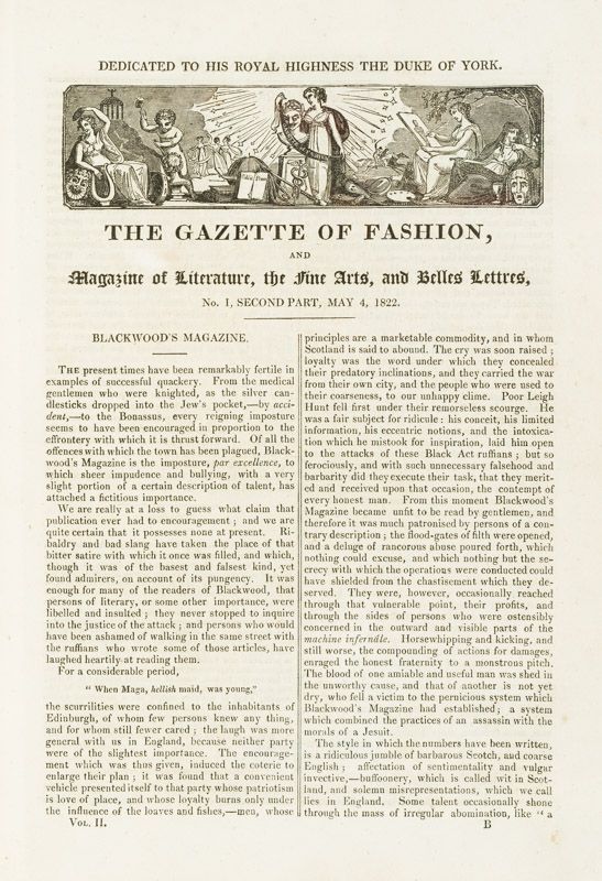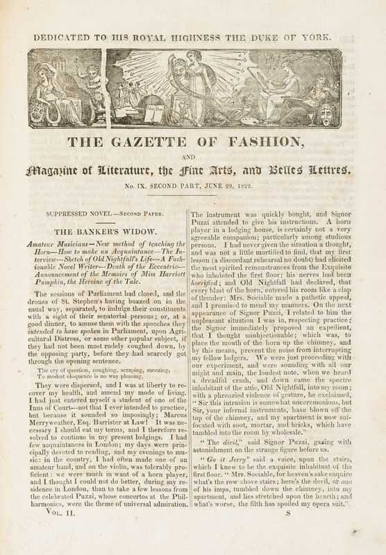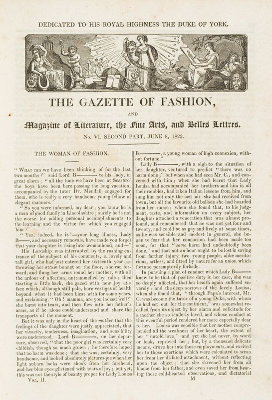 The Gazette of Fashion, and Magazine of The Fine Arts and Belle Lettres, dedicated by permission to His Royal Highness the Duke of York [With the rare Portrait of Lady Mary Wortley Montagu and an early case of “Musical Copyright” discussed on page 137]. Published in weekly, monthly and wuarterly parts. Composed of Original Papers and Music, with Reviews of Literature in General. Illustrated with numerous Engravings, Portraits of Eminent Persons and Subjects connected with Fashion and the Fine Arts.