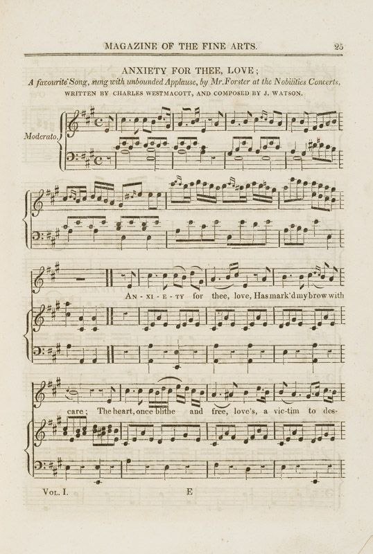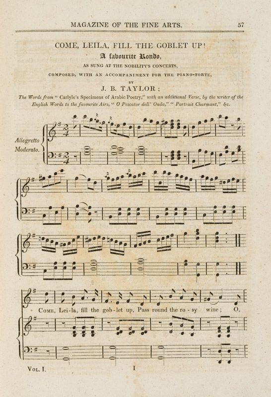 Two Parts in one Volume (First half year from January to July, 1822). London, Published for C.M.Westmacott, by Hoffmann, 1822. Quarto (20 cm x 27 cm). Portrait-Frontispiece, 214, Portrait Frontispiece, 208 pages plus Index for both quarterly parts with listing of all engravings, scores of original pieces of music, portraits, engravings of the latest, “newest” Parisian Costumes etc. Original Hardcover / 19th – century half leather with gilt lettering on spine. With 11 instead of 23 full-page illustrations of which some included are not called for and others seem to have never been part of the collection. Some minor signs of wear only, a few very faint signs of foxing, a little dusty endpapers but especially the text and illustrations all in generally very good or even better condition with some minor signs of wear only. Extremely Rare !