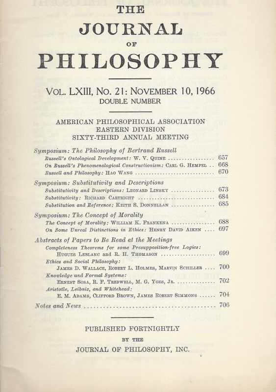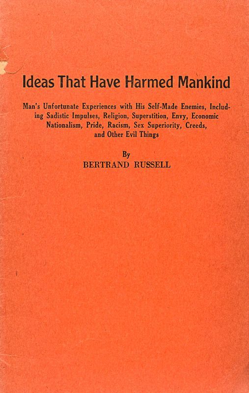 Collection of important publications by and on the British Philosopher Bertrand Russell [some of the publications from libraries of important philosophers like Quine]. The collection includes: 1. Bertrand Russell – War – The Offspring of Fear (First Edition – London, 1914) / 2. Bertrand Russell – Ideas that have harmed Mankind – Man’s Unfortunate Experience with his self-made enemies, including sadistic Impulses, Religion, Superstition, Envy, Economic Nationalism, Pride, Racism, Sex Superiority, Creeds and other evil things. (First Edition – Girard (Kansas), 1946) [From the library of Henry David Aiken] / 3. Bertrand Russell – Scientific Method in Philosophy (First Edition – Oxford, 1914) / 4. [Bertrand Russell] Paul Foulkes – Wisdom of the West (London, 1960) / 5. Bertrand Russell – The Analysis of Mind (London, 1951) / 6. Bertrand Russell – “Per Aspera ad Astra” (in: “Science and the Future of Mankind” – together with essays by Albert Einstein, Robert Oppenheimer others, this copy used to belong to the library of Boston’s “Simmons College”) / 7. Ronald Jager – The Development of Bertrand Russell’s Philosophy [From the library of philosopher Willard Van Orman Quine (with inscription and signed by Jager to Quine)] / 8. Quine, Willard Van Orman / Heimpel, Carl G./ Wang, Hao – Symposium – Issue on Bertrand Russell by “The Journal of Philosophy”: ‘The Philosophy of Bertrand Russell’: Willard van Orman Quine – Russell’s Ontological Development / Carl G. Hempel – On Russell’s Phenomenological Constructionism / Hao Wang – Russell and Philosophy // A Historical Survey of Western Philosophy in its Social and Political Setting.