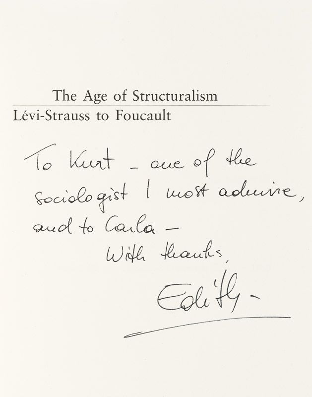 New York, Columbia University Press, 1980. 8°. X, 256 pages. Original Hardcover with original dustjacket in protective collector’s mylar. Excellent condition with only very minor signs of wear. Inscribed and signed by the author to sociologist Kurt Wolff: “To Kurt – one of the sociologist [sic] I most admire, and to Carla – With thanks, Edith”.