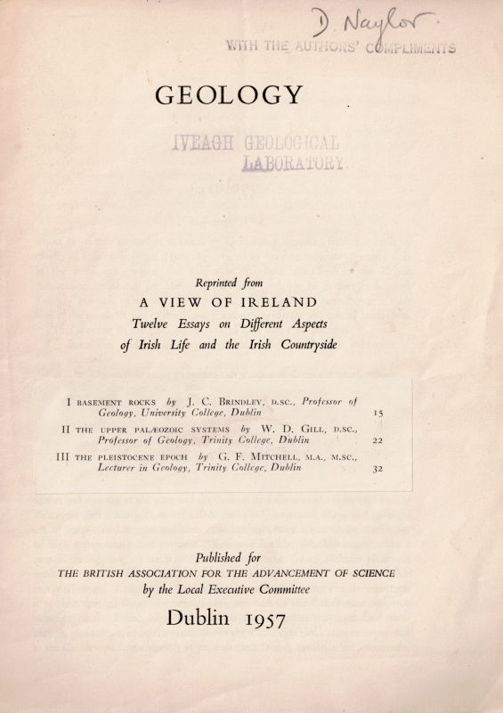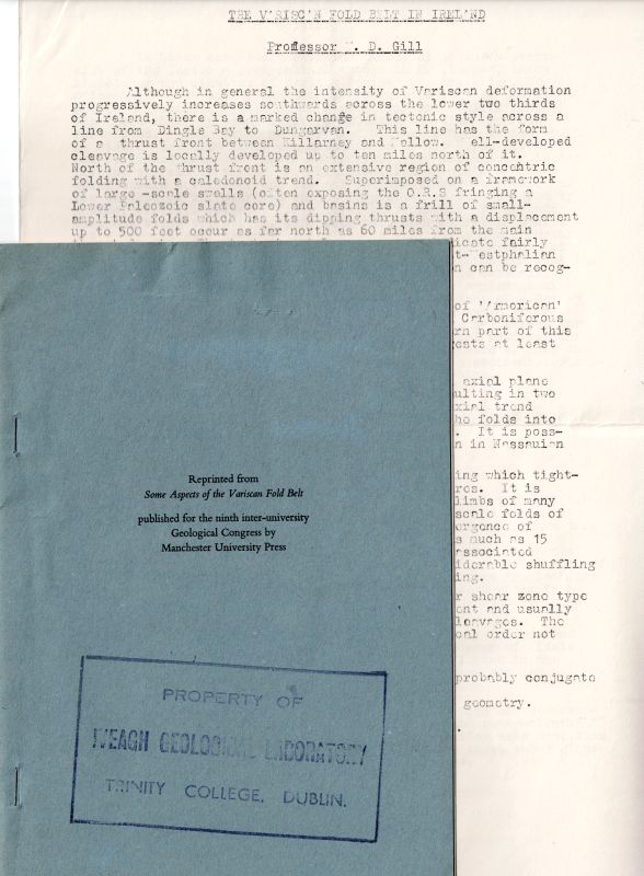 Including a Galley Proof of “The Variscan Fold Belt in Ireland” (stapled) and a presentation copy of the Variscan Fold-publication given from Gill to the Iveagh Geological Laboratory and subsequently owned by David Naylor