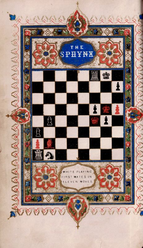 Second Edition, revised. London, Henry G.Bohn, 1848. Octavo. Coloured Frontispiece showing a Chessboard (″The Spynx”) with the position of “White Playing First Mates in Eleven Moves”, VIII, 518 pages. Original publisher’s binding. Red cloth with gilt-embossed chess board on front cover. Very good condition with only minor signs of wear. Very interesting names of 19th and 20th century irish preowners written inside the book: J.J.O’Sullivan in Bantry / W. O’Hanlon (Cork) /