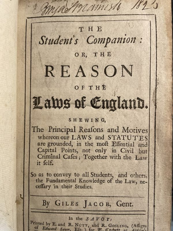 The Student’s Companion : Or, The Reason of the Laws of England. Shewing, the Principal Reasons and Motives Whereon our Laws and Statutes are Grounded, in the Most Essential and Capital Points, Not Only in Civil But Criminal Cases ; Together With the Law it self. So as to Convey to All Students, and others, the Fundamental Knowledge of the Law, necessary in their Studies.