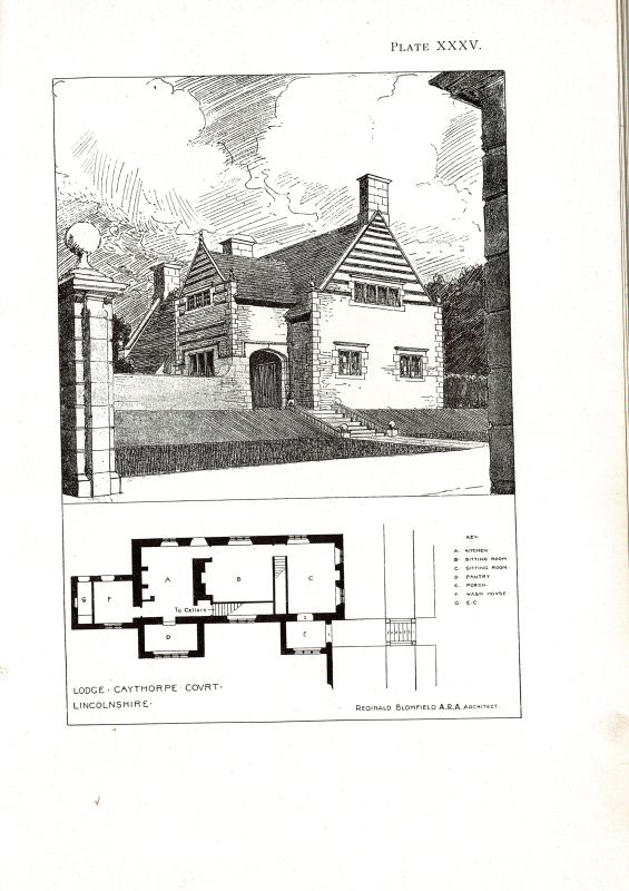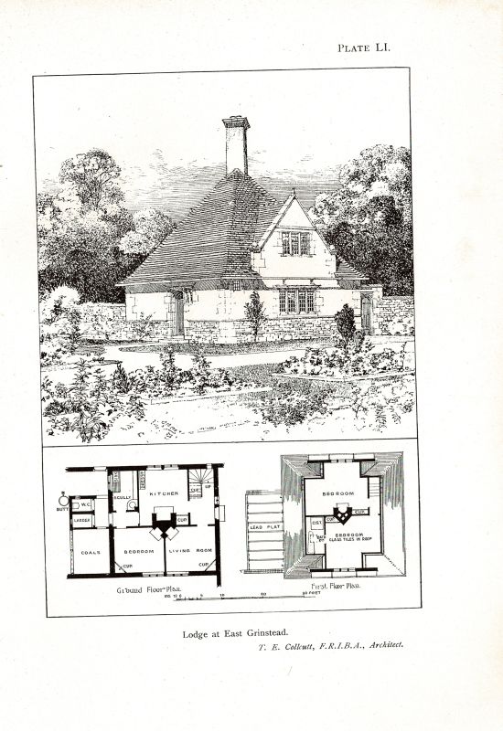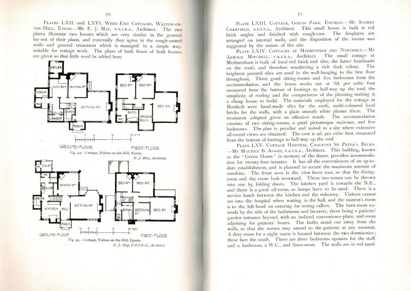 Second Edition – Revised and Enlarged. London, B.T.Batsford, (1912). Quarto (19.2 cm wide x 27 cm high). XII, 81 pages Text plus LXXXIII plates and 4 unnumbered pages oof advertising. Original Hardcover. POOR condition of the binding. Last two pages detached. Bookblock firm and all illustrations in excellent condition. Excellent publication with architectural building-plans of english cottages at the turn of the 19th to the 20th century.