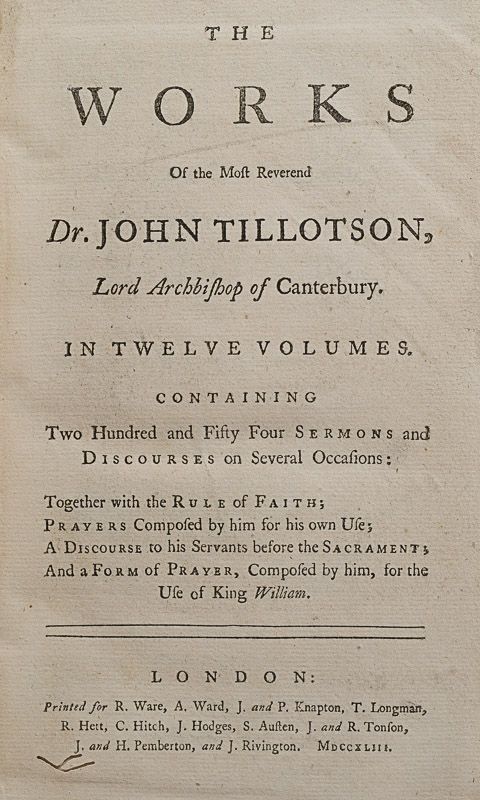 The Works of the Most Reverend Dr. John Tillotson, Lord Archbishop of Canterbury. In Twelve Volumes containing Two Hundred and Fifty Four Sermons and Discourses on Several Occasions: Together with the rule of Faith; Prayers composed by him for his own Use; And a Form of Prayer, composed by him, for the use of King William.