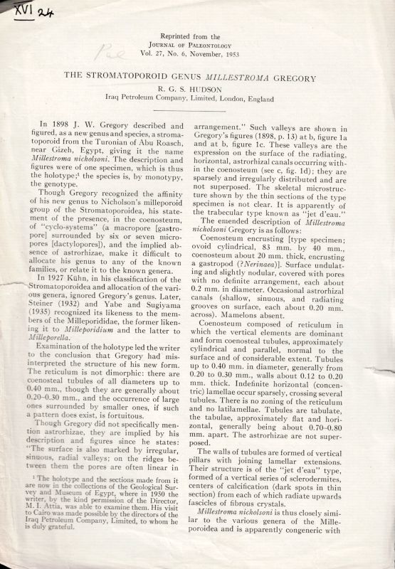 Collection of seven (7) important publications on the Geology of Arabia, Lebanon, Iraq by William Daniel Gill’s Professor and Teacher, english geologist and palaeontologist Robert George Spencer Hudson. The collection includes the following publications (First Editions) by R.G.S.Hudson: 1.Jurassic Stromatoporoids from Southern Arabia. (1954) / 2. Sequanian Stromatooroids from South-West Arabia. (1955) / 3. The Arabian Plate – Producing Fields and Undeveloped Hydrocarbon Discoveries (Large Folding Map from the Year 1990) / 4. Jurassic Stromatoporoids from The Lebanon (1954) / 5. Tethyan Jurassic Hydroids of the Family Milleporidiidae (1956) / 6. The Stromatoporoid Genus Millestroma Gregory (1953) / 7. The Fauna of Some Recent Marine Deposits Nerar Basrah, Iraq (1957) //