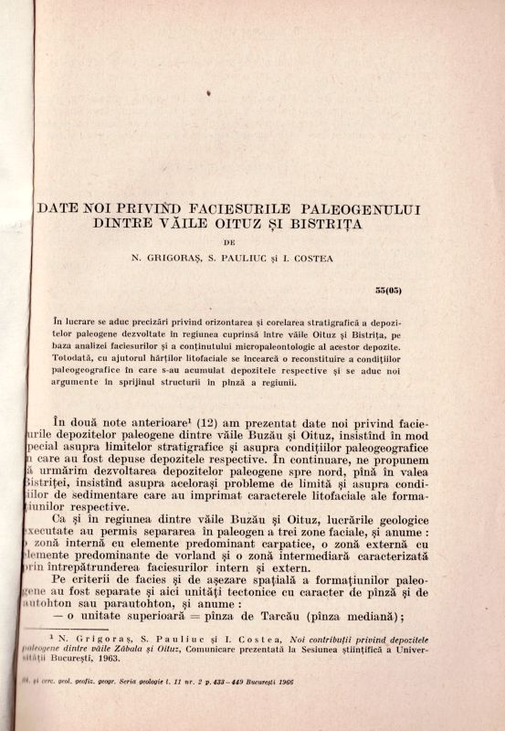 Collection of sixteen (16) important publications on the Geology of Romania and the Carpathian Region from the William Daniel Gill Collection. The collection includes the following publications (all first editions): 1. N. Grigoras and N. Constantinescu – “Geological Activity for Oil and Gas in the Socialist Republic of Rumania” (1969) / 2. N. Grigoras and I. Patrut and M.Popescu – Contributi La Cunoasterea Evolutiei Geologice A Platformei Moesice De Pe Teritoriul R.P.R. (1961) / 3. N. Grigoras – “Rolul Depresiunilor Premontane In Formarea Rocilor Bitumoase Din R.P.R.” (1957) / 4. N.Grigoras – “Consideratii Privind Legile De Raspindire Ale Zacamintelor De Petrol Si Gaze Din R.P.R” (1961) / 5. N.Grigoras and S.Pauliuc and I. Costea – “Date Noi Privind Faciesurile Paleogenului Dintre Vaile Oituz Si Bistrita” (1966) / 6. N.Grigoras and S.Pauliuc and I.Costea – “Noi Contributii Privind Depozitele Paleogene Dintre Vaile Zabala Si Oituz” (1964) / 7. N.Grigoras and S.Pauliuc and I. Costea – “Date Noi Privind Depozitele Paleogene Dintre Valea Putnei Si Valea Buzaului” (1963) / 8. N.Grigoras and T. Danet – “Contributi La Cunoasterea Sisturilor Verzi Dobrogene” (1961) / 9. N.Grigoras – “Contributiuni La Cunoasterea Geologie Reg.Craiova – Caracal”(1961) / 10. N.Grigoras – “Geologie des Cisements de Petrole et de Gaz en Roumanie” (1966) – Inscribed and signed by N.Grigoras / 11. Ekim Boncev – “Probleme der Lineamenttekonik im oestlichen Teil der Balkanhalbinsel” (1965) / 12. G.Manolescu and E.Soare – “Unity of the Nature of the Relative Permeability Curves in Relation with The Different Wetting Fluid Phases of a Porous Medium and Possibility of their Analytical Expression” (1962) / 13. D.Patrulius – “Olistolitele Masivului Bucegi” (1963) – Inscribed and signed by Dan Patrulius to William Daniel Gill / 14. Mircea Sandulescu – “Stratigrafia Si Tectonica Molasei Micocene Din Regiunea Valea Mare – Berzunt – Onesti”(1959) / 15. M.Sandulescu – “La Structure de la Zone Cristallino-Mesozoique de L’Interieur de la Courbure des Carpathes” (1965) / 16. Geological Map of Poland – “Harta Geologica” Scara 1:200.000 – No.36. “Ploiesti” Nota explicativa de: M. Sandulescu et. al. (1968) /