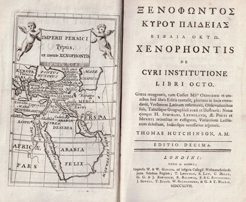 Edition Decima [Bilingual in Greek and Latin]. London, Impensis W.&W.Ginger, ad insignia Collegii Westmonasteriensis juxta Scholam Regiam, 1797. Octavo. Frontispiece-Map, [2], 548 pages. Hardcover / Original full leather with gilt lettering on spine and boards. In protective Mylar. Very good condition with only minor signs of wear. From the library of Daniel Conner (Connerville / Manch House), with his Exlibris / Bookplate to pastedown.
