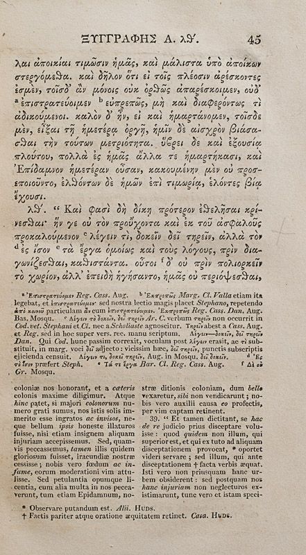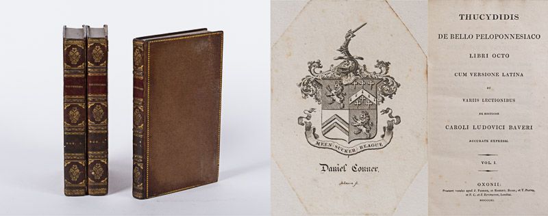 Bilingual Edition (Greek-Latin). Three Volumes [complete set]. Oxford, J.Parker, 1811. Octavo. Pagination: Volume I:XXIV, 440 pages / Volume II: 418 pages / Volume III: 266 pages plus 60 unnumbered pages of Index Rerum and Index Verborum. Hardcover / Original full leather with gilt lettering and ornament on spine and boards. Occasional annotations and textmarkings. Bindings rubbed and a little dusty but very firm and overall in very good condition with only minor signs of wear.Hinges all attached with only the front boards of Volume I and II slightly starting. Besides a few dogears a nd minor signs of only occasional foxing in very good + condition. From the library of Daniel Conner (Connerville / Manch House), with his Exlibris / Bookplate to pastedown. This is a rare version of this text !