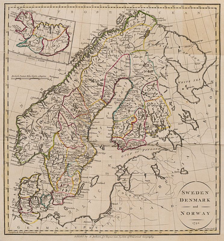 [Sweden, Denmark, Norway and Iceland] – Hand-coloured Large Fold-out-Map of “Sweden – Denmark and Norway” (1792)