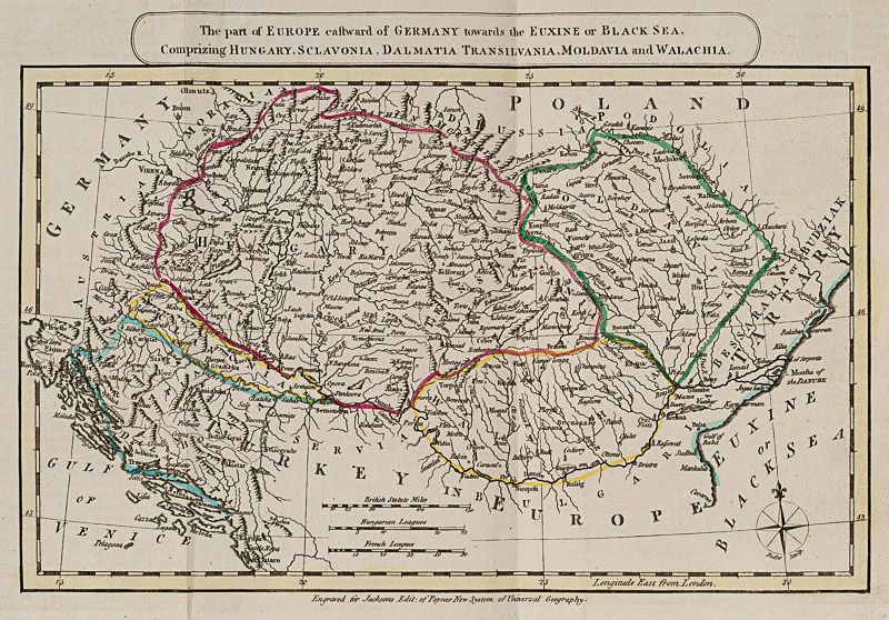 [Danube Region] – Hand-coloured Large Fold-out-Map of “The Part of Europe eastward of Germany towards the Euxine or Black Sea, Comprizing Hungary, Sclavonia, Dalmatia, Transilvania, Moldavia and Walachia [Colour Map – 30 cm wide x 20 cm high]