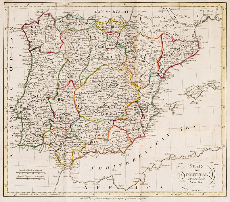 [Spain / Portugal] – Hand-coloured Large Fold-out-Map of “Spain and Portugal from the latest Authorities”