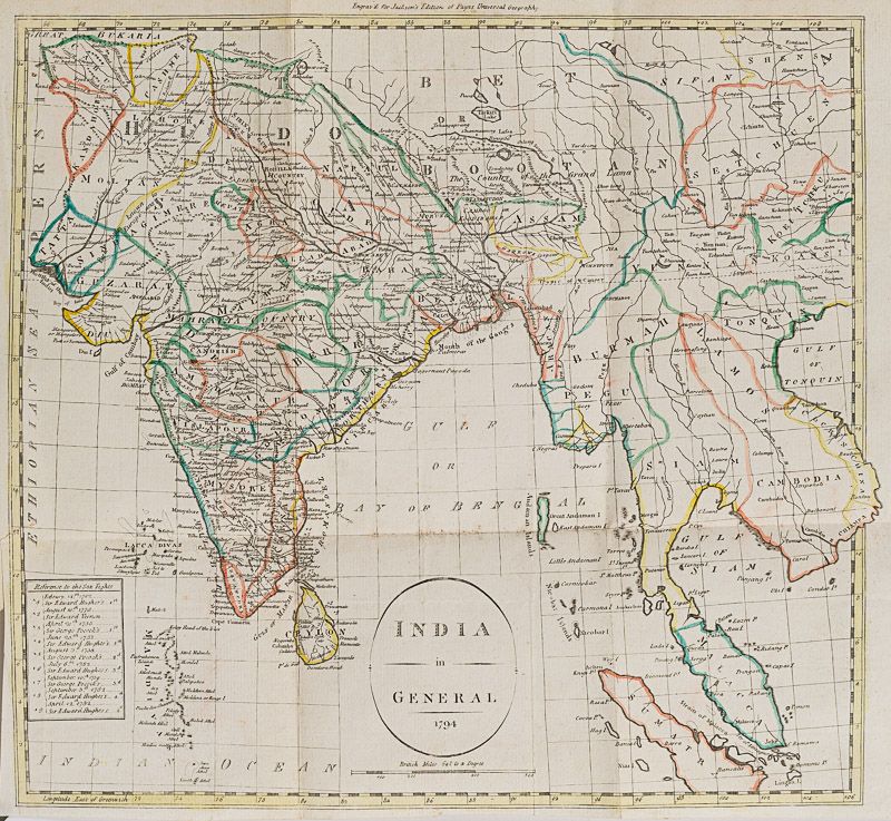 [India] – Hand-coloured Large Fold-out-Map of India in General (1794) [Colour Map – 41.5 cm wide x 35.5 cm high]