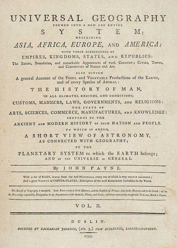 Universal Geography – Formed Into A New And Entire System; Describing Asia, Africa, Europe And America ; With Their Subdivision Of Empires, Kingdoms, States And Republics : The Extend, Boundaries, and remarkable Appearances of each Country ; Cities, Towns, and Curiosities of Nature and Art. Also giving A general Account of the Fossil and Vegetable Production of the Earth, and of every Species of Animal : The History of Man, In all Climates, Regions, And Conditions ; Customs, Manners, Laws, Governments, And Religions : The State of Arts, Sciences, Commerce, Manufactures, And Knowledge : Sketches of the Ancient and Modern History of each Nation and People. To which is added, A Short View of Astronomy, As Connected With Geography ; Of The Planetary System to which the Earth belongs ; And of the Universe in General. With a Set of Maps, drawn from the best Materials, every one of which is very neatly coloured ; And a great Variety of Copper-Plates ; Descriptive of the most Remarkable Curiosities in the World. [This Edition with all three Volumes but only with 14 Maps, 3 Colour-Engravings and 5 Black-and-White Engravings (see detailed listing of these Maps and Engravings at the end of this Bibliography)].