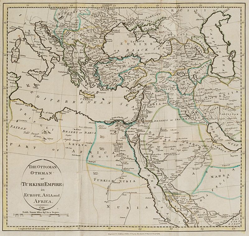 [Ottoman / Turkish Empire] Hand-coloured Large Fold-out-Map of “The Ottoman, Othman or Turkish Empire in Europe, Asia and Africa (1792) [36 cm wide x 34.5 cm wide]