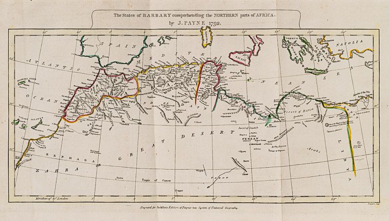 [Barbary / Northern Africa] Hand-coloured Large Fold-out-Map of “The States of Barbary comprehending the Northern parts of Africa” by J.Payne, (1792) [including Morocco, Fez, Algiers, Tunis and Tripoli] [40 cm wide x 21 cm high]