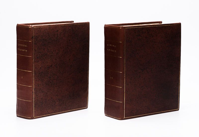 Two Volumes in Three Parts (bound in Two Volumes). Dublin, Printed by Zachariah Jackson, 1793 – 1794 Quarto (23 cm wide x 28 cm high). Pagination: Volume I: Hand-coloured Frontispiece, VI [Subscribers], XIII, 894 pages [page 555 misprinted as 454] [Stating “The End” at the end of the Volume] with Four Maps and Three engravings (including Frontispiece) / Volume II: Hand-coloured Frontispiece, 792 pages [Stating “End Of The Second Volume” at the end of Volume II] with Ten Maps and One Engraving (Frontispiece) / [Volume III] is Bound to the rear of Volume II and is falsely ending with “End of The Second Volume” even though it is the “Continuation of Book IV” and in all other listings of this book internationally is accepted to be Volume III. Pagination of [Volume III]: Hand-coloured Frontispiece, [No separate titlepage], 416 pages, XXXIII pages of an Index, 1 page “Directions to the Binder”, 10 pages “A Chronological Table of Remarkable Events, Discoveries and Inventions”, with Four Engravings (including Frontispiece). Hardcover / Modern Binding in the style of the 18th century. Full leather with gilt lettering on spine. Very minor signs of neglectable, minimal wormhole-damage. Obviously this work was robbed of many of the maps but those which remain have the original hand-colouring in stunning condition (see description). Overall near Fine condiiton of this extremely rare set, with only minor signs of wear. Page 199/200 of Volume II with longer cut (Text not effected). All the engravings and maps without defects.