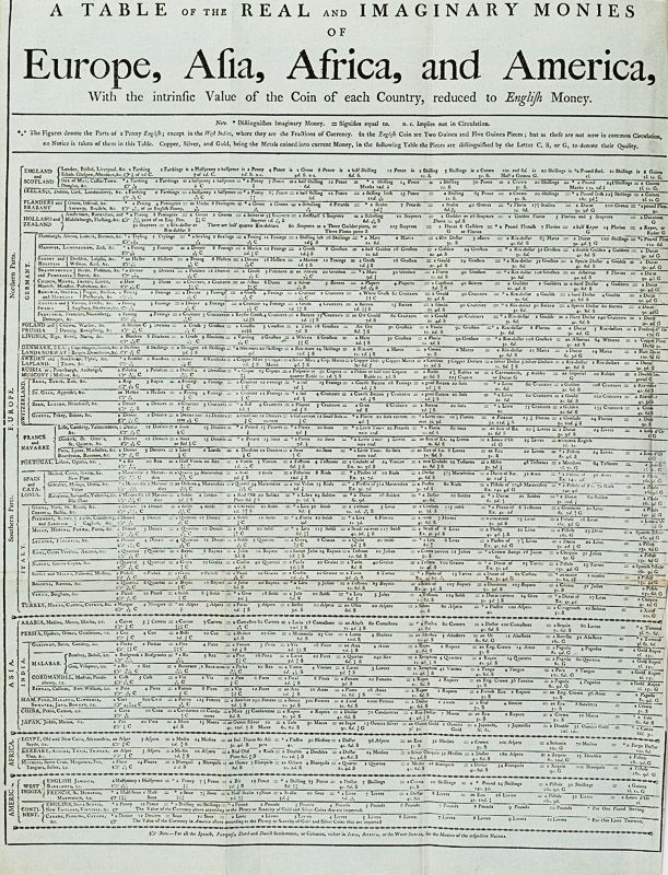 [Money Table] “A Table of the Real and Imaginary Monies of Europe, Asia, Africa and America – With the intrinsic Value of the Coin of each Country, reduced to English Money” [Black-and-White] / [45 cm wide x 59 cm high]