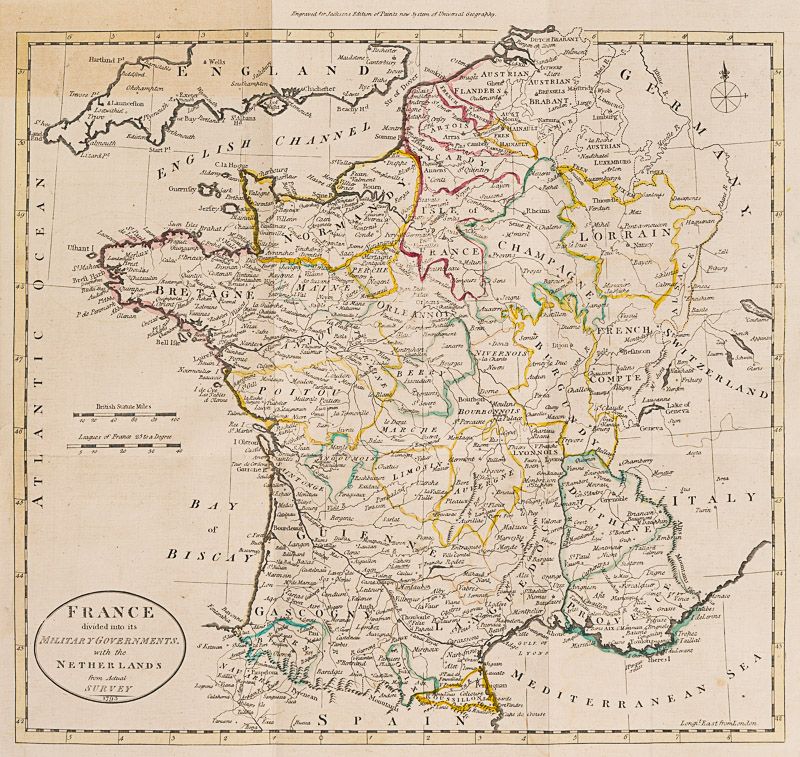 [France] – Hand-coloured Large Fold-out-Map of “France divided into its Military Governments with the Netherlands from Actual Survey”(1793) [Colour Map – 37.5 cm wide x 68 cm high]