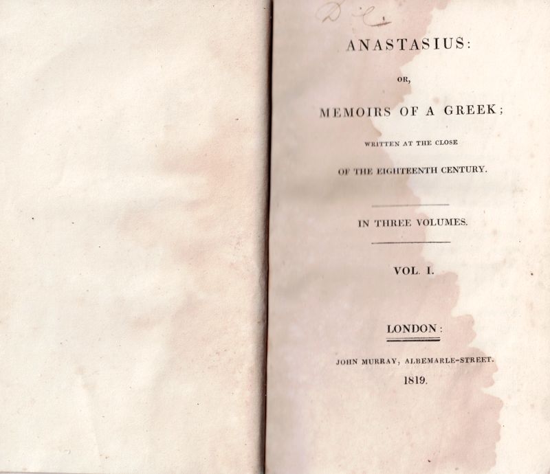 1819: Anastasius: or, Memoirs of a Greek; Written at the close of the Eighteenth Century.