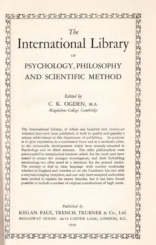 First Edition. London, Kegan Paul, Trench, Trubner & Co., 1931. Octavo. XVIII, 292 pages. First edition with a later bound-in Catalogue of books from “The International Library”, published by Kegan Paul (20 pages). Hardcover / Original Publisher’s cloth. Very good condition with only minor signs of wear. Some rubbing to upper and lower spine only. Binding firm with endpapers completely intact. Minor signs of occasional foxing. Extremely Rare !!