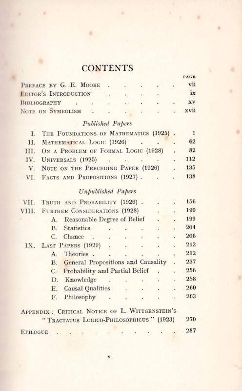 The Foundations of Mathematics and other logical Essays [With the first edition in book-form of a Review of Ludwig Wittgenstein’s ‘Tractatus Logico-Philosophicus’ as an Appendix to this Volume]. Edited by R. B. Braitwaite. With a Preface by G. E. Moore.