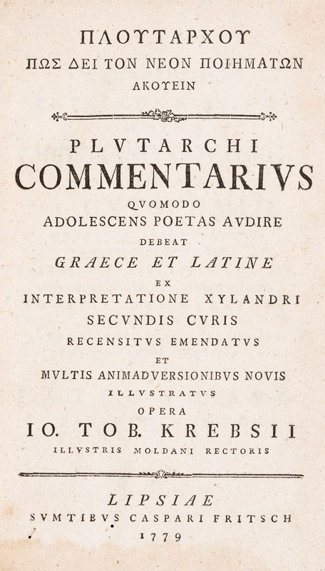Plutarchi Commentarius Quomodo Adolescens Poetas Audire. Debeat Graece et Latine ex Interpretatione Xylandri Secundis Curis Recensitus Emendatus et Multis Animadversionibus Novis Illustratus Opera Io. Tob. Krebsii Illustris Moldani Rectoris.