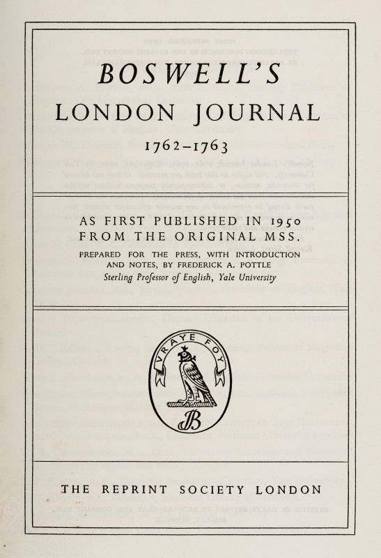 Boswell’s London Journal 1762 – 1763. As first published in 1950 from the original MSS. Prepared for the press, with introduction and notes, by Frederick A. Pottle, Sterling Professor of English, Yale University.