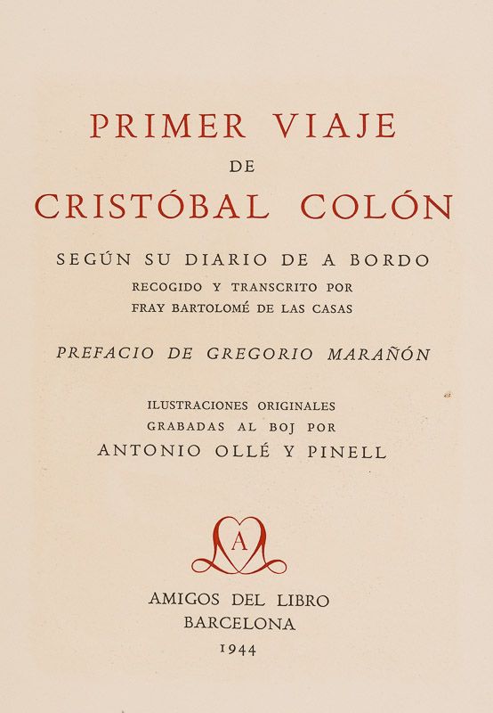 Primer Viaje de Cristóbal Colón. Según su diario de a bordo recogido y transcrito por el padre Bartolomé de las Casas. Original artwork etched onto boxwood by Antonio Ollé Pinell. [Ilustrado con 13 grabados originales a todo color. Impresión a dos tintas].